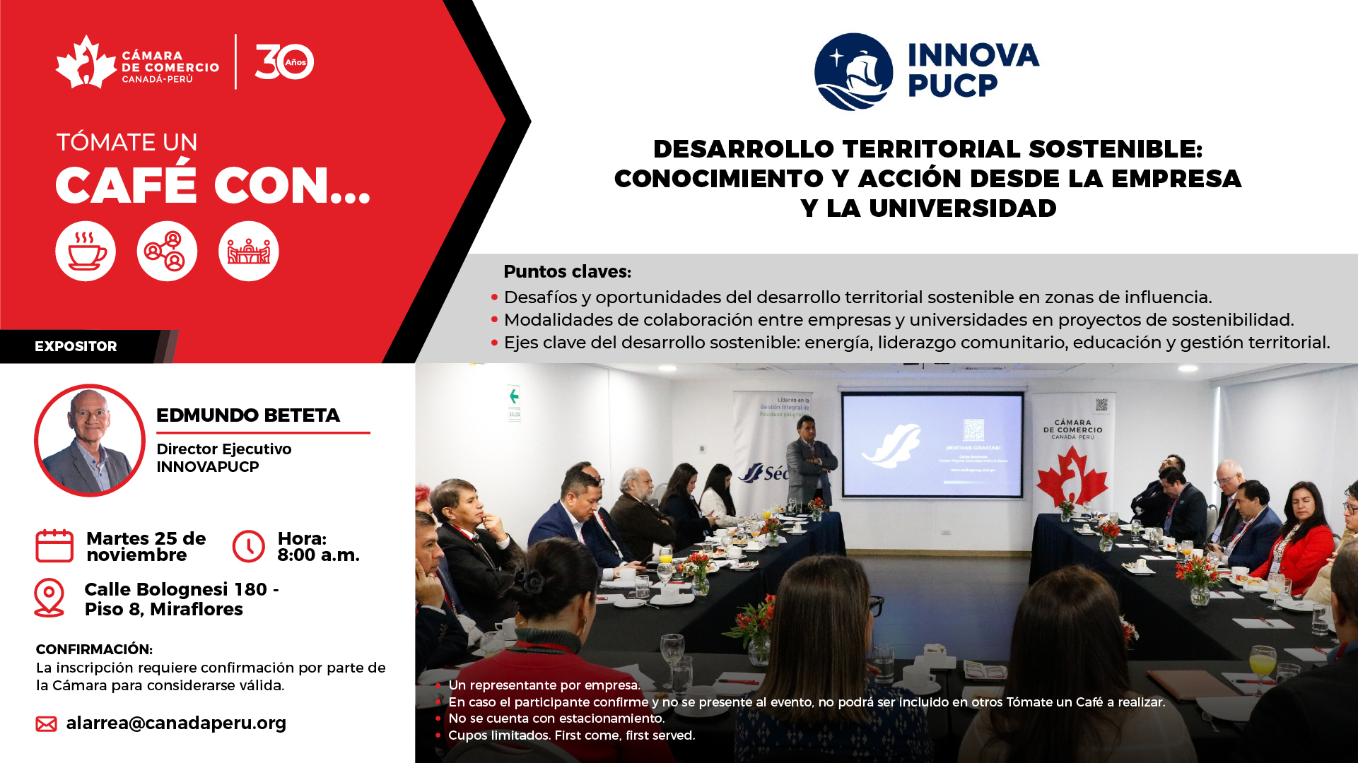 El desarrollo territorial sostenible requiere del trabajo conjunto entre diversos actores. Bajo esta premisa, INNOVAPUCP y la Cámara de Comercio Canadá–Perú organizan una nueva edición de Tómate un Café titulada “Desarrollo territorial sostenible: conocimiento y acción desde la empresa y la universidad”, un espacio de conversación que busca fortalecer la articulación entre la academia y el sector empresarial para generar impacto real en las comunidades.